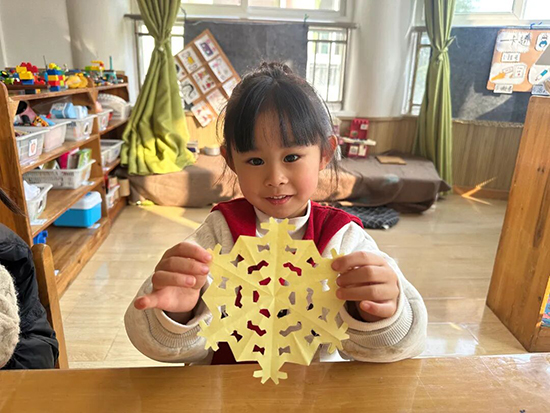 “大雪到,雪花飄。”中班孩子們化身小小藝術(shù)家,沉浸式投入雪花剪紙創(chuàng)作。他們充分發(fā)揮想象力與創(chuàng)造力,手持彩紙與剪刀,剪出了形態(tài)各異的雪花——有的形似閃爍的星星,有的宛如舒展的花瓣,有的層層疊疊錯(cuò)落有致。剪好后,孩子們互相展示、分享作品,教室里仿佛呈現(xiàn)出“雪花紛飛”的冬日盛景。剪紙過(guò)程中,孩子們的動(dòng)手能力與審美素養(yǎng)得到提升,也對(duì)大雪節(jié)氣的自然景象形成了直觀而深刻的認(rèn)知。