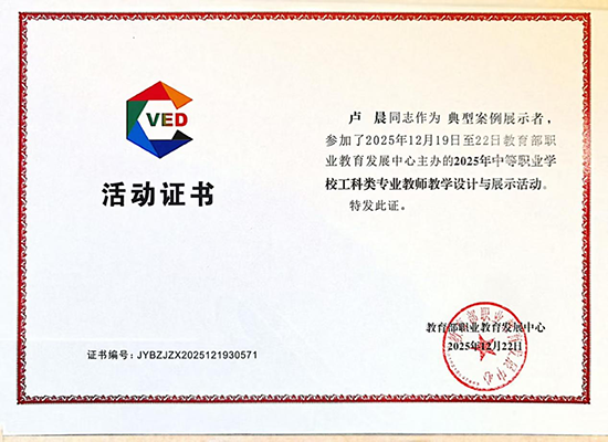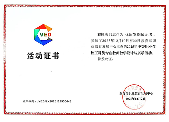 2025年12月20日,由中國教育部職業教育發展中心主辦、高等教育出版社等單位承辦的“2025年中等職業學校工科類專業教師教學設計與展示活動”在福州圓滿落幕。經過激烈角逐,臨海市中等職業技術學校教師盧晨老師憑借其卓越的教學設計作品《東風風光580 曲軸位置傳感器的檢測與更換》,從全國近130位交通類學科參賽教師中脫穎而出,榮獲“典型案例展示”獎項(一等獎);程鈺鷹憑憑著匠心之作《一筆繪鴟吻,一紙承古建:古建鴟吻復原圖的繪制》榮獲“建筑優質案例展示”獎項(二等獎)。