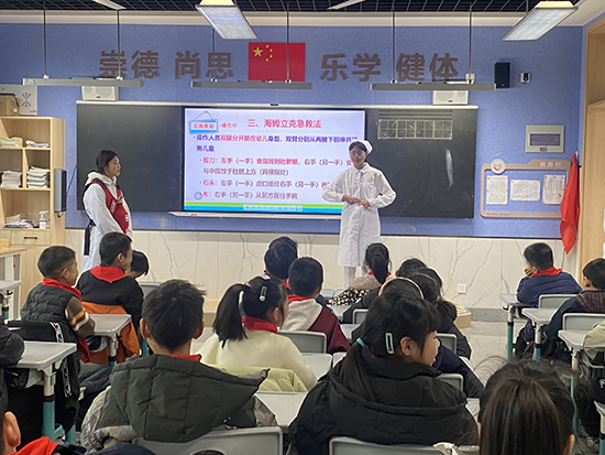 為深化專業實踐教學,錘煉學生健康宣教能力,12月24日,海寧衛生學校(海寧市綜合高級中學)護理專業2509班學生前往江南小學,為三年級學生講授了一堂生動、專業的海姆立克急救科普課。本次課程由學生團隊自主設計與主講,她們們巧妙運用專業教具與趣味口訣,將復雜的急救知識轉化為小學生易懂易學的技能,圓滿完成了從“學習者”到“傳授者”的角色實踐。