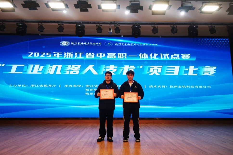 12月12日至14日,2025年浙江省中高職一體化試點(diǎn)賽“工業(yè)機(jī)器人技術(shù)”項(xiàng)目在杭州市蕭山區(qū)第一中等職業(yè)學(xué)校舉行,德清職業(yè)中專與湖州職業(yè)技術(shù)學(xué)院組成的學(xué)生團(tuán)隊(duì)榮獲一等獎(jiǎng)。團(tuán)隊(duì)由23機(jī)器人3+2班郭想和湖州職業(yè)技術(shù)學(xué)院虞添兩位學(xué)生組成,學(xué)校黃宇老師和湖職院張芹老師擔(dān)任指導(dǎo)教師。