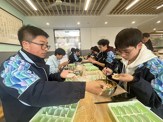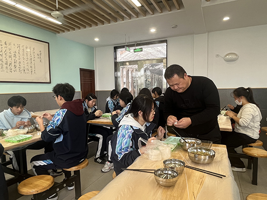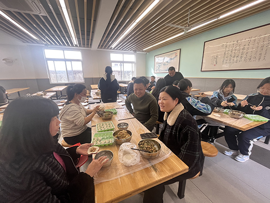 活動當天,食堂一改往日“單向供餐”的模樣,搖身變成溫馨的“家庭廚房”。有的家長手法嫻熟,搟出的餃子皮薄如紙、圓如月。有的學生第一次包餃子,雖然包得歪歪扭扭,卻滿臉自豪。老師們也不甘示弱,一邊包一邊打趣:“這褶子捏得,比我寫教案還認真!”