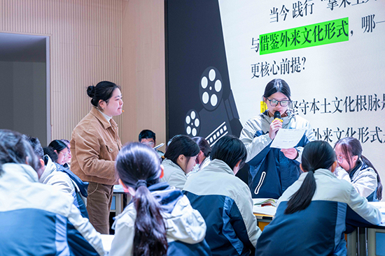 第二組《拿來主義》同課異構別出心裁,衢州市工程技術學校雷歡老師以“文化診療”為線索,拆解魯迅的論證邏輯與語言智慧。寧波外事學校高濤老師則以《哪吒2》《花木蘭》為案例,將經典與當代文化融合結合,從“拿來”進階到“共生”,讓經典文本在時代語境中煥發新活力,實現思維與價值的雙重引領。