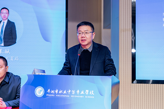 王獻講話。他代表平湖市教育局向蒞臨活動的領導、專家和老師們致以熱烈歡迎,向主辦單位省教育廳職成教教研室、嘉興市教育學院表示衷心感謝。王獻以“地域優越、經濟富饒、人文平和”三個關鍵詞介紹了平湖的地理位置、產業經濟和人文底蘊。他表示,職業中專是平湖職教的金字招牌與城市名片。他期待本次年會能夠匯聚全省智慧,破解中職語文教學服務學生發展、支撐產業升級的時代課題,助力職教高質量發展。