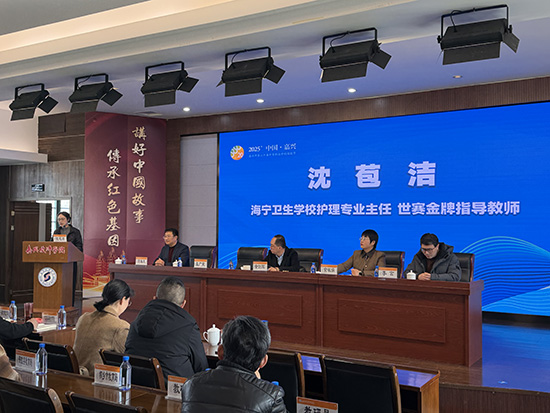 閉幕式上,海寧衛校(海寧市綜合高中)的亮眼成績再次成為焦點。學校獲評“優秀組織獎”;學校在世界職業院校技能大賽總決賽排位賽中創造的輝煌——打破省地市中職參賽隊及全國中職護理參賽隊歷史紀錄的優異表現,被多次提及,贏得全場廣泛贊譽。海寧衛校護理專業主任、世賽金牌指導教師沈苞潔作為教師代表登臺,分享了學校在技能人才培養、賽事備戰中的經驗做法。從課程體系構建到實訓平臺搭建,從師資團隊建設到個性化指導策略,沈苞潔的分享干貨滿滿,為兄弟學校的技能人才培養工作提供了寶貴借鑒。
