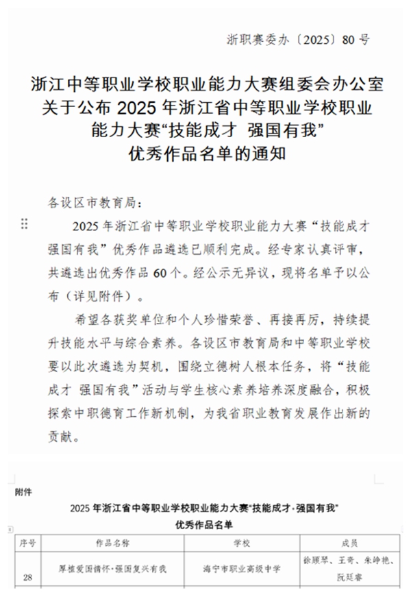 日前,2025年浙江省中等職業(yè)學校職業(yè)能力大賽“技能成才 強國有我”優(yōu)秀作品遴選結(jié)果揭曉。經(jīng)評審,海寧市職業(yè)高級中學徐顧琴、王奇、朱崢艷、阮廷睿老師撰寫的《厚植愛國情懷 強國復興有我》脫穎而出,成功入選省級優(yōu)秀作品名單,充分展現(xiàn)了海職高在愛國主義教育的探索實踐成果。